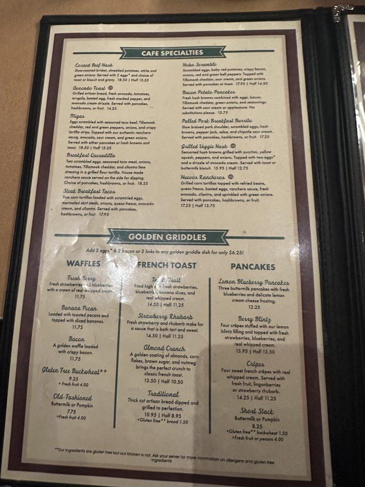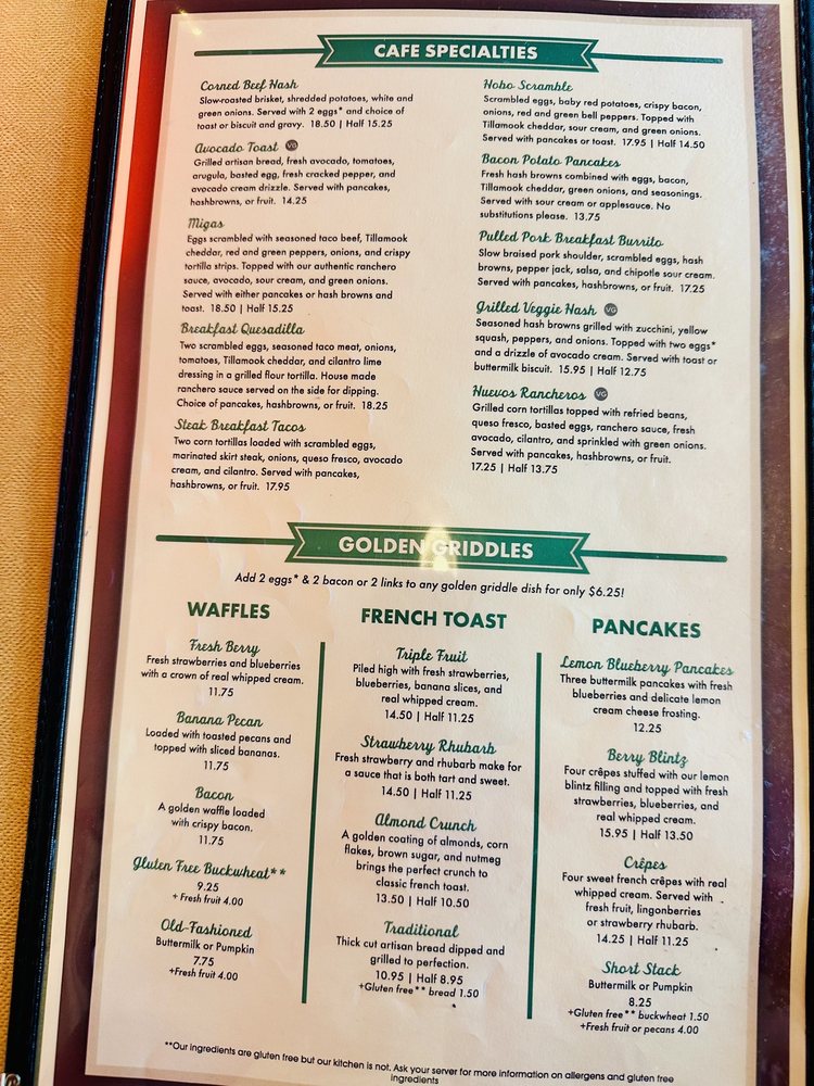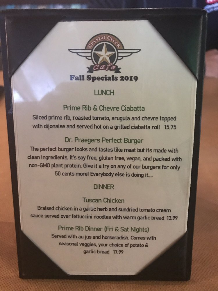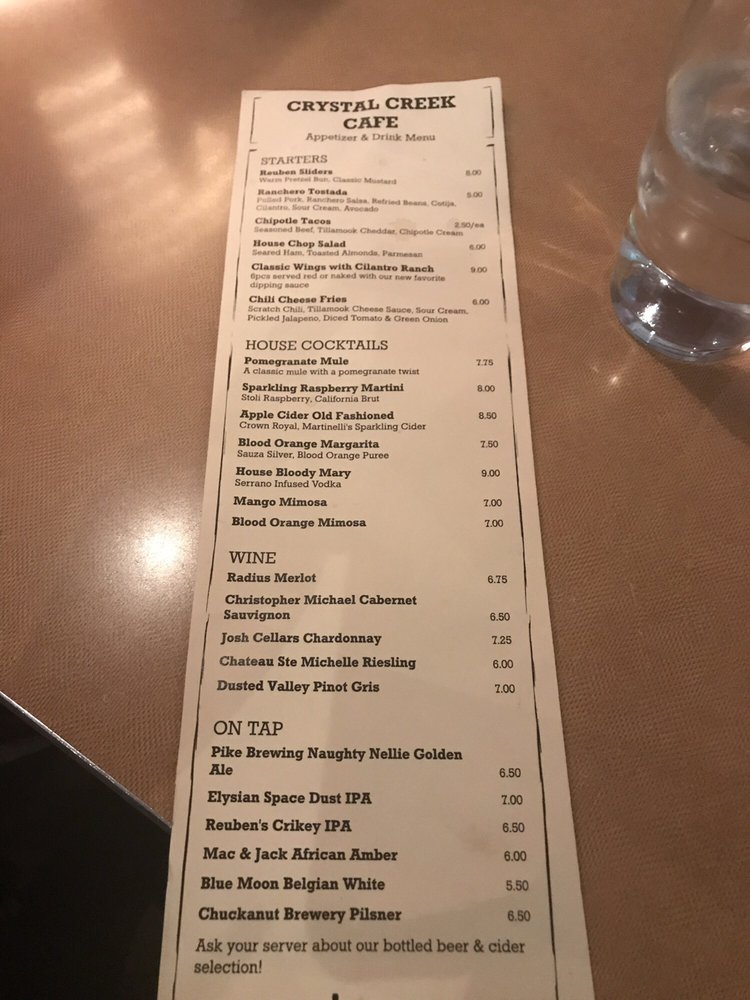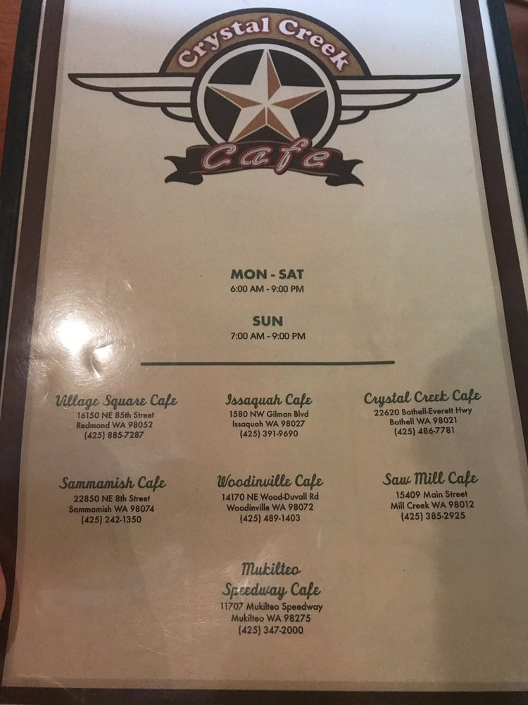 Introducing the menu at Crystal Creek Cafe in Bothell, WA. This diner offers a variety of American breakfast and brunch options, including country fried steak, pulled pork eggs benedict, and classic sandwiches. With many vegetarian choices and plastic-free packaging, it caters to a diverse range of customers. The cozy decor and friendly service make this cafe a popular spot, with regulars praising the fresh food quality and affordable prices. The menu features half orders and a full bar with happy hour specials. The waitstaff, like Cedric and Frank, are known for their exceptional customer service, adding to the welcoming atmosphere. Expect a wait during peak times but be rewarded with delicious dishes like chicken fried steak and French toast. Crystal Creek Cafe is a must-visit for a satisfying breakfast or brunch experience.