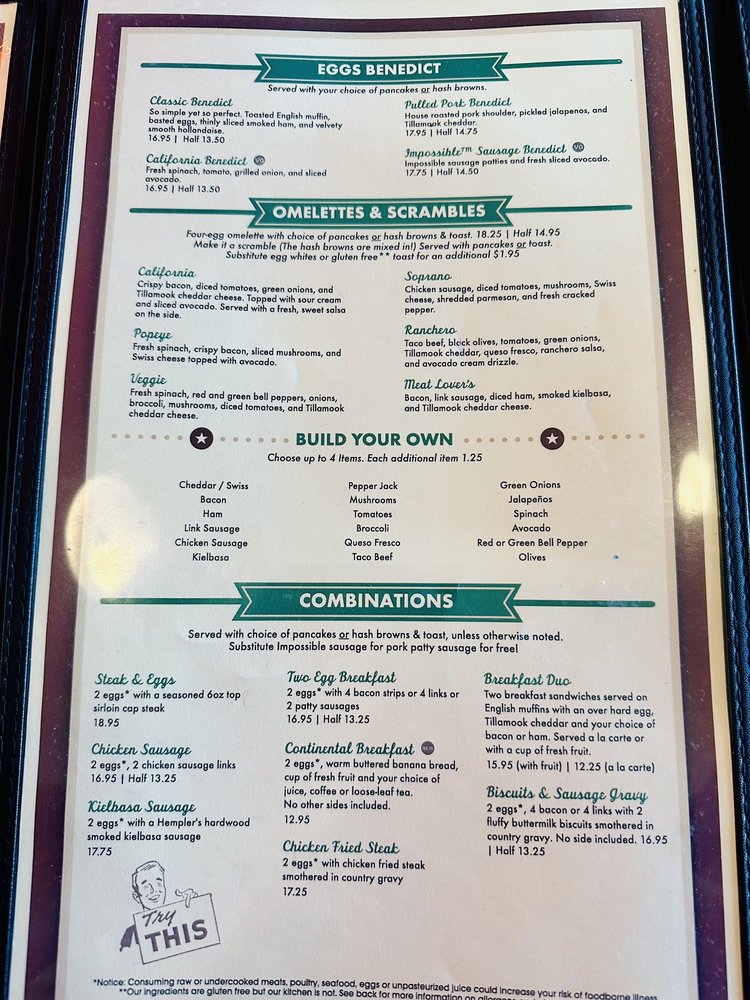 eggs, bacon or links with fluffy buttermilk biscuits smothered in country gravy. No side included.